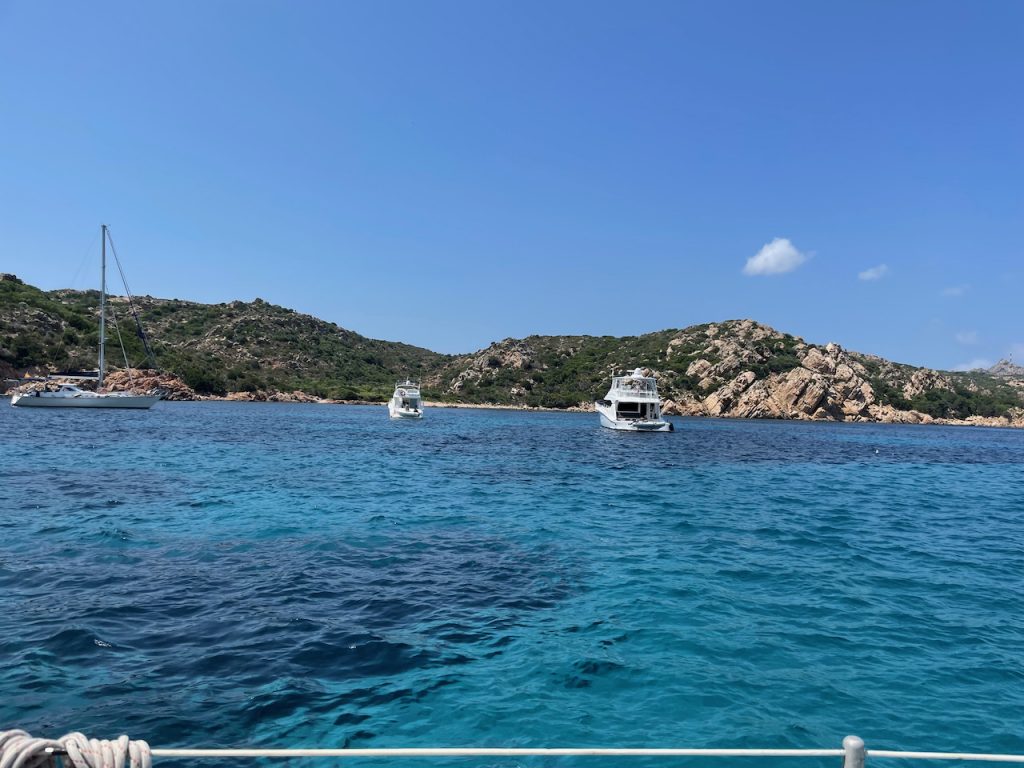 Weiter ging es Richtung „Costa Smeralda“ wieder bei schönem Segelwind. Die Fock hat uns schön Richtung Süden gezogen, es war ein bisschen böig (20kt), darum reichte uns die Fock und es ging erstaunlich gut. Markus beschloss uns ne kleine Hafenrundfahrt in Porto Cervo zu gönnen. Irre was da für Riesenboote im Hafen liegen, etwas dekantiert und erdrückend, aber interessant das mal gesehen zu haben. Wir steuerten eine wunderschöne Bucht mit türkisfarbenem Wasser an der Costa Smeralda an, leider waren schon zu viel Boote drin und wir gingen ne Bucht weiter. Dieser Ankerplatz war fast genauso schön, das Wasser nicht ganz so türkis, dafür aber nicht so überfüllt. Das Wasser war wirklich toll, ein bisschen schnorcheln, ein bisschen planschen was will man mehr. Zwischendurch gibt es natürlich auch immer wieder gewisse Pflichtaktivitäten zu erfüllen, aber bei der Umgebung auch nicht weiter schlimm.
