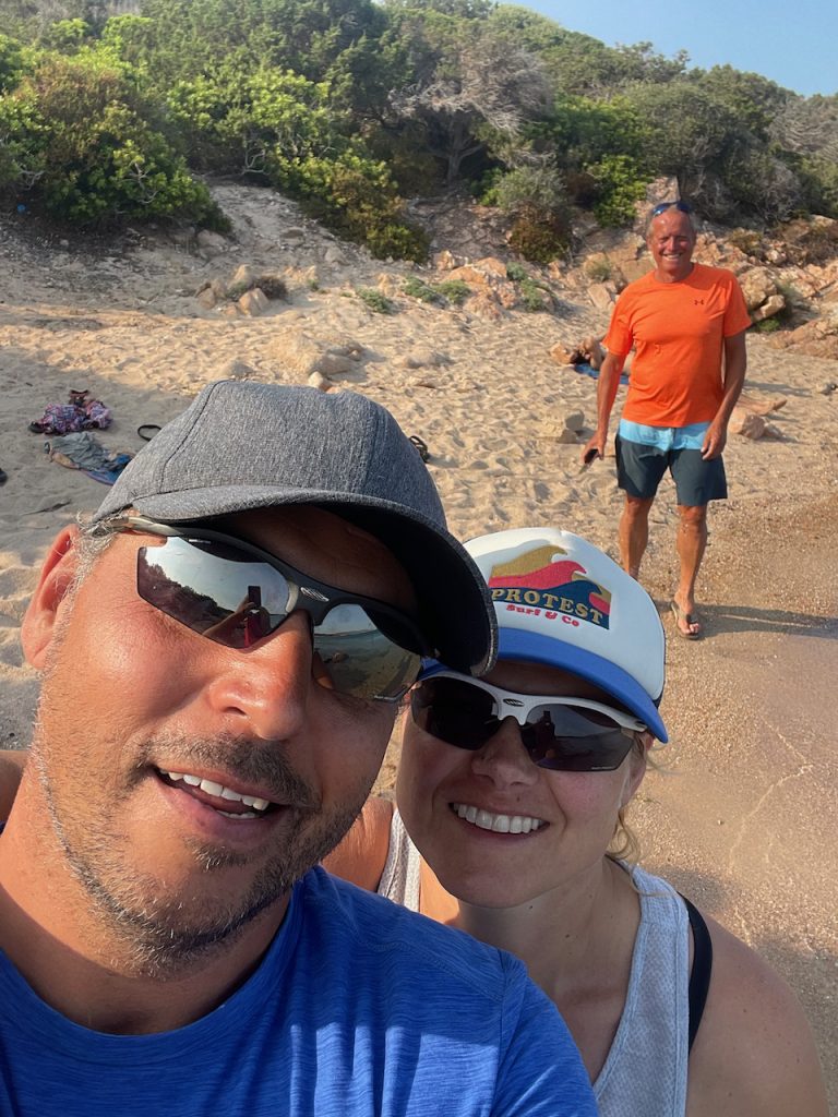 Abend spazierten wir durch die Gässchen und genehmigten uns einen kleinen Absacker in ner coolen Bar. Am nächsten Tag gings weiter Richtung „Cala Portese“, eine Bucht der Isola di Caprera. Wir hatten wieder einen schönen Segeltag, guter Wind und ne schöne Ankerbucht. Der Wind sollte in der Nacht zunehmen, aber Markus hat uns eine gute Bucht ausgesucht. Am Spätnachmittag gingen wir an Land und machten ne kleine Wanderung und entdeckten ein paar einsame tolle Strände. Zum Abendessen gab es wieder Fisch, den wir leider nicht selber gefangen haben, aber morgens selbst vom Fischer gekauft haben.