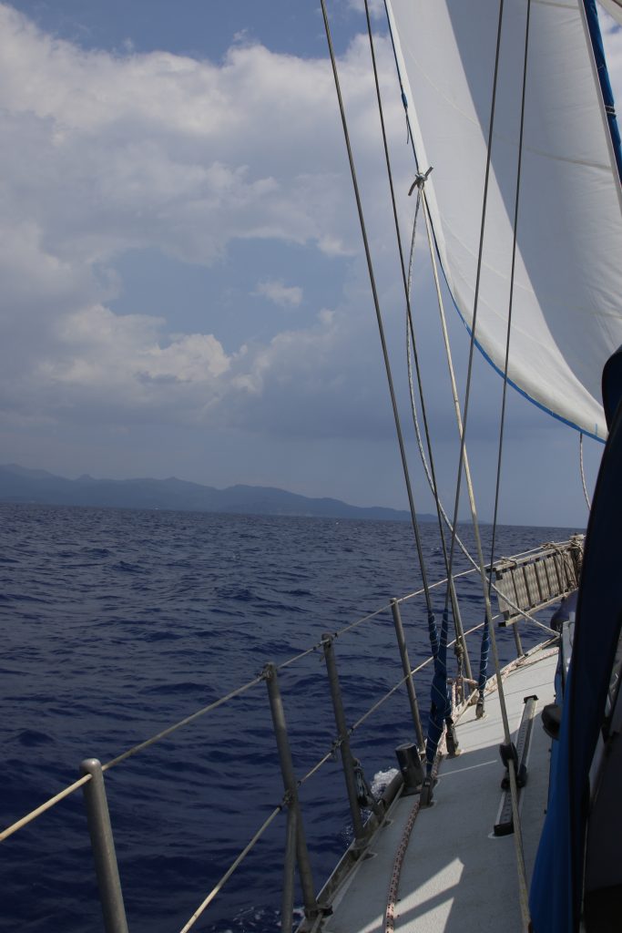 Am nächsten Morgen waren wir uns erst nicht ganz einig, ob wir wieder nach Cagliari oder weiter in die nächste Bucht ans Capo Carbonara sollten, nach kurzer Diskussion entschieden wir uns noch ne Nacht zu ankern. Los ging`s erst unter Motor, dann mit der Genua. Anker gesetzt, ins Wasser gehüpft, Snack eingenommen, chillen und dann kam das vorhergesagte Gewitter. Wieder Regen und ein bisschen Wind, Anker hält, zum Glück.