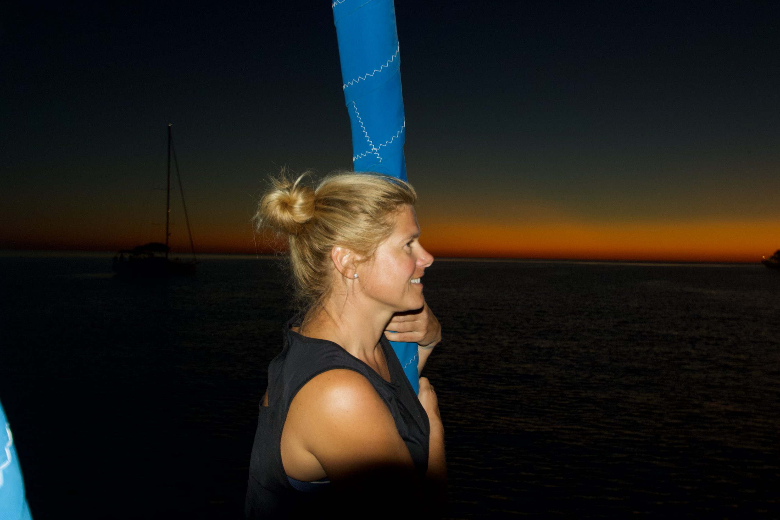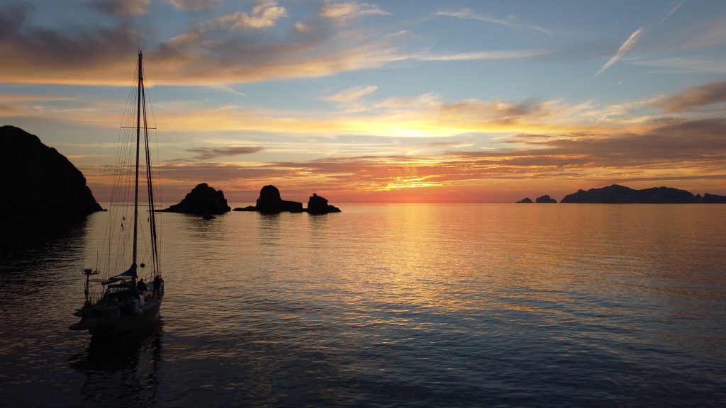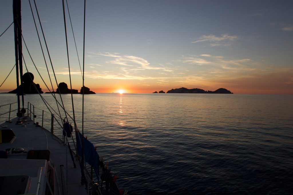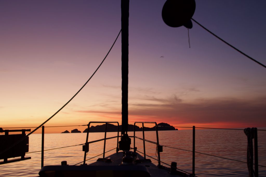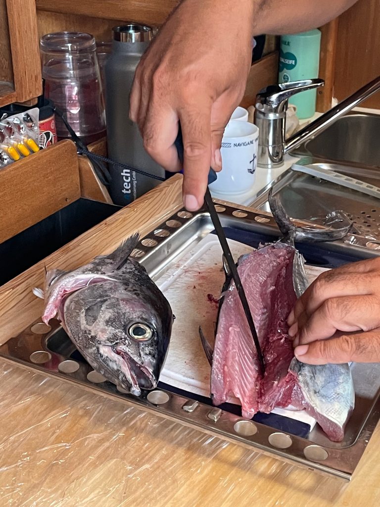 Am nächsten Morgen beschlossen wir nochmal unser Dinghi runterzulassen und nen Fisch im Ort zu kaufen, damit wir ihn am Abend in einer einsamen Bucht schön grillen können. Wir segelten unsere Inselumrundung fertig, es war ein schöner Wind und wir wollten ja die ganze Insel sehen. Markus musste natürlich gleich seinen neuen Angelhaken testen und …… Ja, wirklich es hat einer angebissen. Ein wunderschöner kleiner Tuna. Abendessen war gesichert, es gab Fisch und dazu Fisch (es lag ja schon einer im Kühlschrank). Ja und so lagen dann später halt zwei leckere Fische auf dem Grill in der einsamen Bucht.
